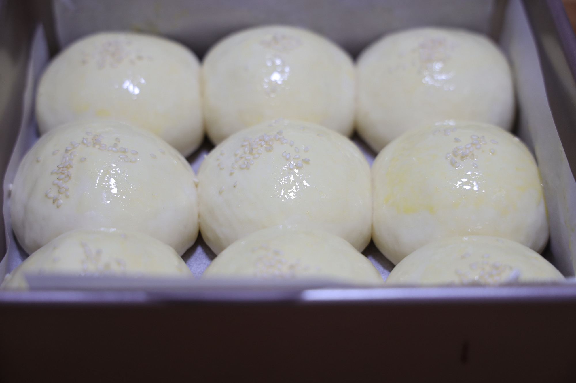 7、发酵好的面团,用手指轻轻按压还能缓慢回弹就发酵好了,再在表面刷一层薄薄的全蛋液,撒适量的白芝麻;