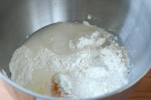 制作配料:高粉300克 低粉100克 奶粉20克 白糖35克 鸡蛋1个 酵母4克 清水200克 盐3克 黄油25克