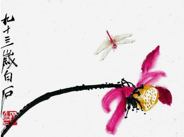 在中国有许多国画的大师,比如齐白石,齐白石是中国近代的绘画大师,是世界文化名人。擅长画花鸟鱼虫、山水人物等,一副墨虾图享誉海内外。齐白石除了虾之外,还有一幅红蜻蜓字画。蜻蜓最美的就是它的翅膀,最难画的也是它的翅膀,因为蜻蜓的翅膀是透明的,但是其中又有着许多的小网,首先要把蜻蜓的蜻蜓的翅膀画成透明的就已经很难了,能够掌握这种笔墨技术的实为罕见,齐白石就是其中一个。