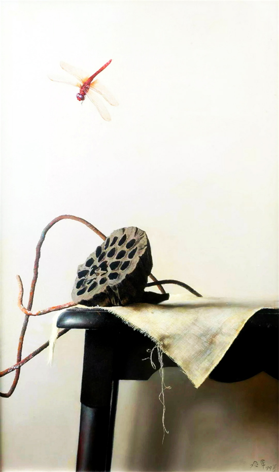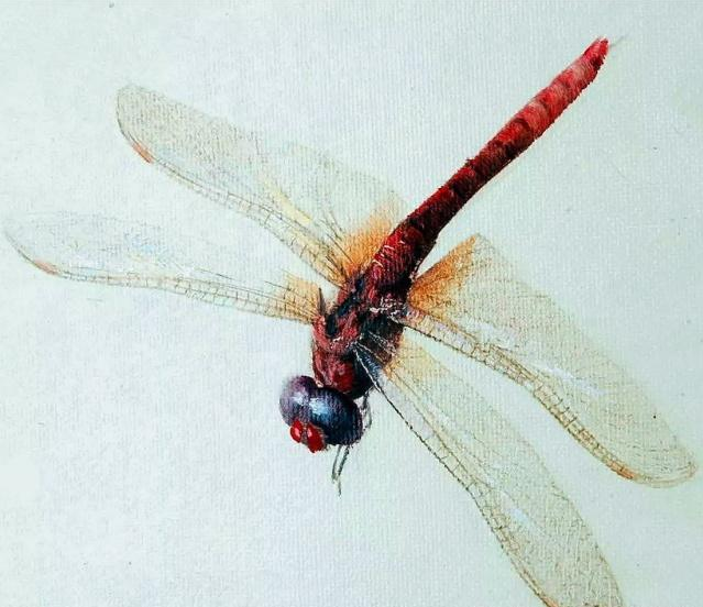 国画中画出透明的感觉,实属难得,而在油画中就更加不易了。我们都知道油画是以颜色鲜明著称,而要画透明的感觉,就需要很高超的技术了,而冷军就拥有这这项高超的技术。冷军画的红蜻蜓在翅膀上,和齐白石是各有千秋。齐白石的红蜻蜓,在放大的情况下,看到它的全身都是红色的,一样是向下冲,尾巴挺成直线,这与现实中的蜻蜓是差别的。而冷峻的红蜻蜓除了眼睛与尾巴的后部分是红色的,在其他部分则是黑紫色的,与现实中的红蜻蜓更为相似。