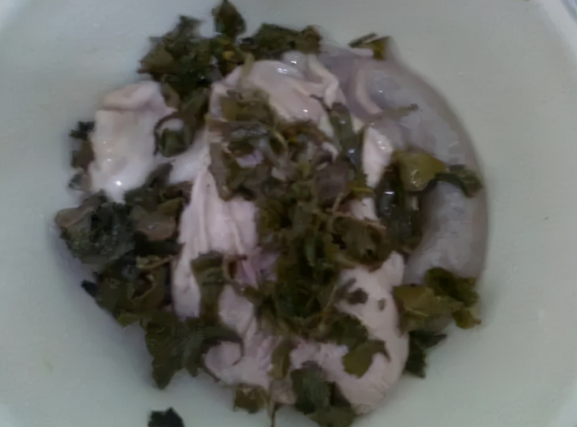 5、内层的腥臭味比较重,除了用食盐、面粉洗,还要加入加入一些茶叶,继续用手揉搓,用茶叶搓洗猪肚。茶叶有很清新的香味,能有效取出猪肚的腥臭味,还能把残留的脏东西搓下来,让猪肚变干净。