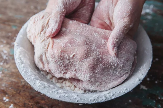 3、把猪肚放进盆子里,先倒入半碟食盐、半碗面粉,下手进行抓洗。生猪肚含有一些细菌,加入食盐可以杀菌,这样更加干净。面粉的颗粒很细,有很好地吸附作用,能把猪肚上的粘液都洗下来。用手揉搓几遍,会发现面粉已经变黑、变黏了,就是把粘液洗掉了。