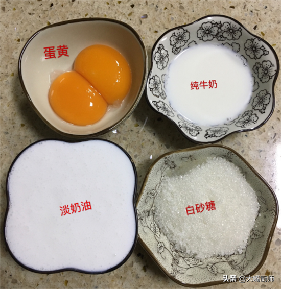 1盒动物奶油,1包纯牛奶、鸡蛋、白砂糖、奥利奥饼干。