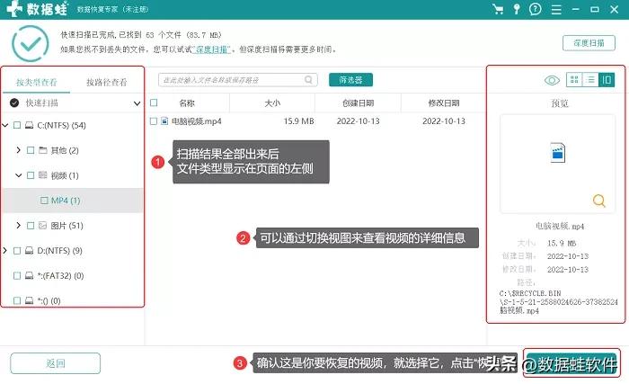 步骤3:扫描结果全部出来后,文件类型显示在页面的左侧,选择你要恢复的视频。你也可以通过切换视图来查看视频的详细信息。确认这是你要恢复的视频,就选择它,点击“恢复”。