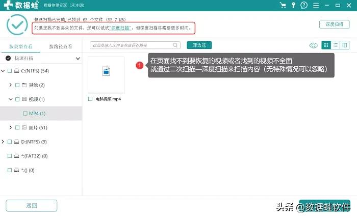 步骤2:第一次扫描的结果属于快速扫描,在页面找不到要恢复的视频或者找到的视频不全面,就通过二次扫描—深度扫描来扫描内容(无特殊情况可以忽略),为了搜寻更多内容,扫描时间比较长,需要等待一会。