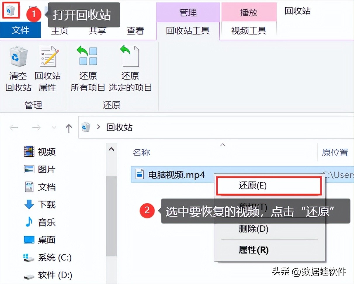 有时候有些软件会定时帮你清理电脑垃圾,比如电脑管家。(这个情况适合删除的间隔时间没有很久)。怎样才能找回删除的视频?打开电脑的回收站,找到你要恢复的视频,右键点击该视频,选择“还原”,视频就能恢复到原本的位置了。