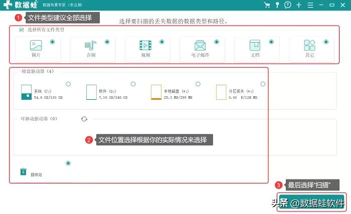步骤1:为了扫描更全面,即使你要恢复的是视频,也建议你在文件类型上全部选择。文件位置选择根据你的实际情况来选择,外部设备(相机、监控等)需要内存卡连接电脑才能选择。最后选择“扫描”。