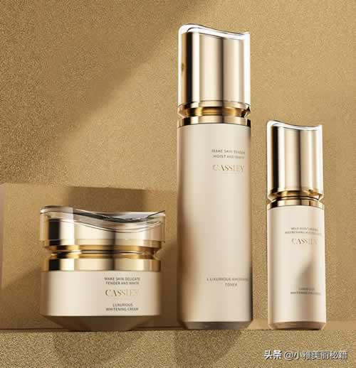 卡丝的这款套装被称为亮肤三部曲,由爽肤水+美白精华乳+美白霜组成。整体外观采用的是高奢风格,给人一种特别贵妇高大上的感觉。