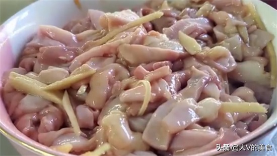 第二步腌制猪肚。把处理干净的猪肚切成细条片,加入盐、生抽、蚝油、料酒、生姜片搅拌均匀,静置腌制20分左右即可。