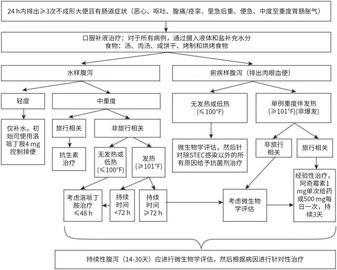 成人急性腹泻(疑似感染性病因)的经验性治疗和诊断性治疗方法见图1。