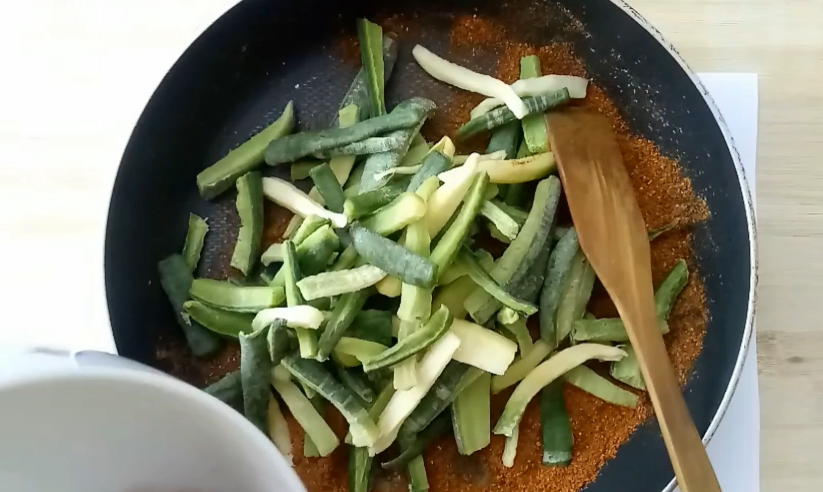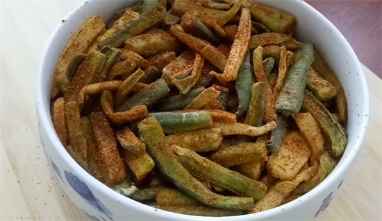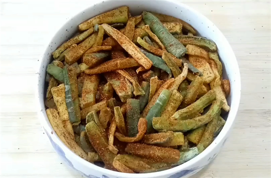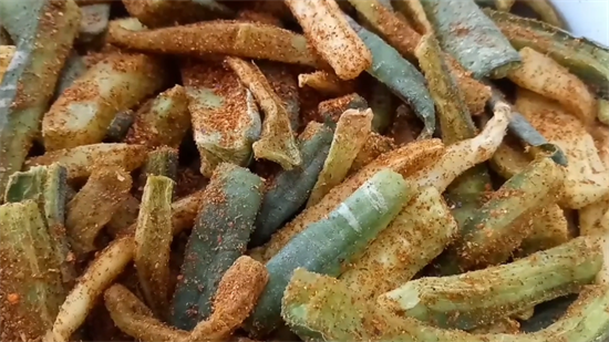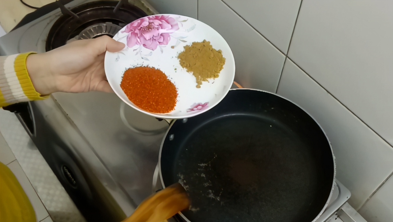 ④萝卜干晾晒好了之后用手掰一下,非常的软,而且咬一口下去很脆爽,这时把它收起来,在锅中加热,然后放入准备好的辣椒面,花椒面和五香粉搅拌均匀,把它干炒出来香气。