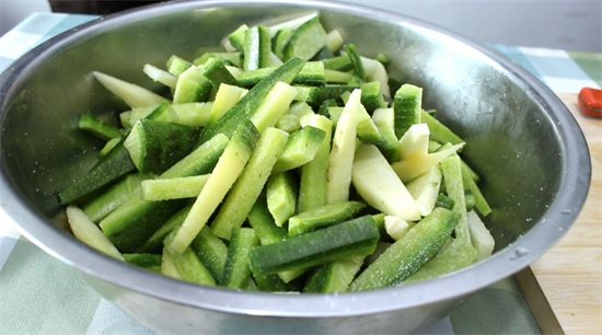 ②接下来就把萝卜放入一个大盆中,撒上适量的盐,盐一定要多放一些,保证每一根萝卜都沾染上盐分,然后腌制三个小时左右,充分的把萝卜里面的水分腌制出来,加入这一步之后能够使萝卜变得更加清脆爽口。