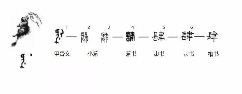 甲骨文右侧的字符是一只右手,手下有一个点儿。这个字符组合可表示手中抓住可滴血的东西或滴出液体的东西或有许多东西抓不完全。