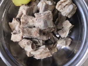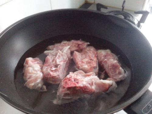 3、接着锅烧清水,水中放入料酒一勺,将排骨冷水下锅,焯水五分钟备用,过程中撇去浮沫,五分钟后将其捞出控水备用。