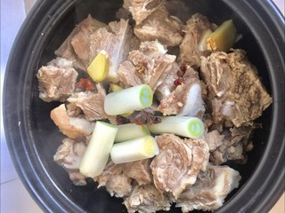 4、接着净锅加入少许底油,将料头放入锅里煸香,煸香后加入清水少许,清水的量以没过排骨5指高为准。接着将排骨放入锅内。开大火烧开,中小火炖至20分钟备用,二十分钟后,只需加入精盐少许调味即可出锅装盘。