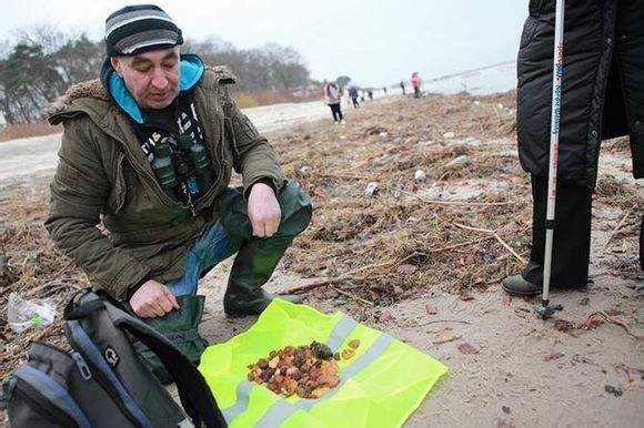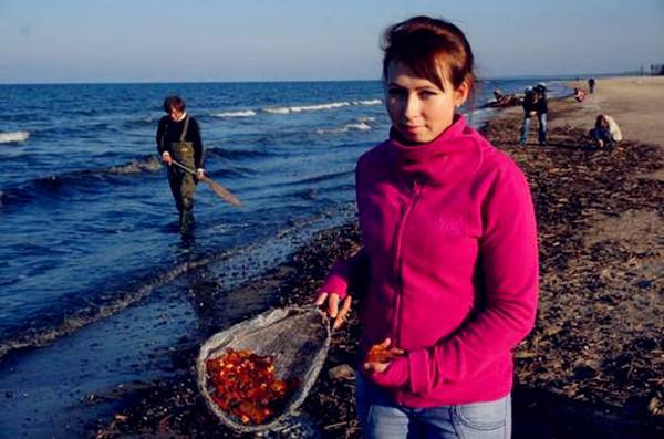 追溯古老的海珀的采集过程也非常有趣,l9世纪中叶,那时几乎所有波罗的海琥珀都是从海中采收的。通常在冬季的风雪过后,大量琥珀被海浪冲刷出来并携带到岸边,与同时被波浪带至岸边的海藻纠缠在一起。海藻携带着它们随着潮水在海湾漂浮。当地的农民专门收集这些海藻作肥料,而琥珀是他们收集海藻过程中的副产品,大量的琥珀就是在收集海藻过程中被发现的,这些夹杂在海藻中的海珀成了他们意外收获。如果不是当地农民在收集海藻的过程中及时地将琥珀收集,这些海珀也会长时间漂浮在大海上,被海浪带来带去,最终被渡涛撞击得粉身碎骨。另外,在较平静的海域内,人们则往往利用采集工具,采用深海采捞的方式采集琥珀。长期以来,由于波罗的海中的海珀被大量无限制采集,到了20世纪中叶开始逐渐减少,产量已经大不如以前了。