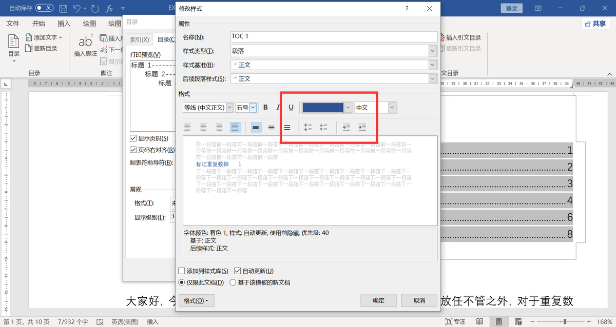 弹出窗口,可以修改目录文字的格式,这里修改了目录文字的颜色。