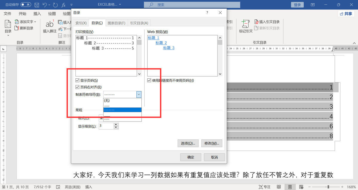 弹出窗口,可以修改目录是否显示页码、对齐方式、制表符前导符等。
