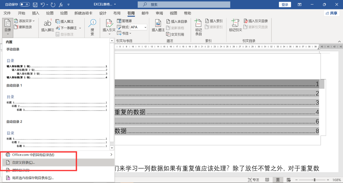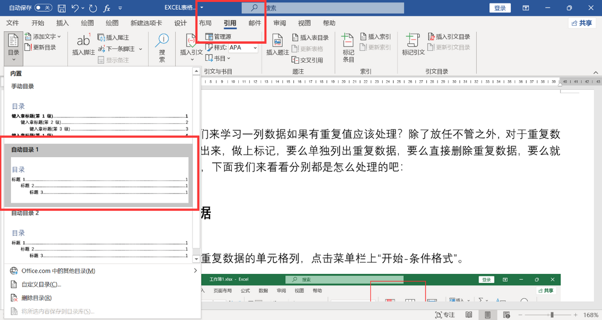 设置完成标题样式后,点击菜单栏上“引用-目录”,下拉选择“自动目录”。