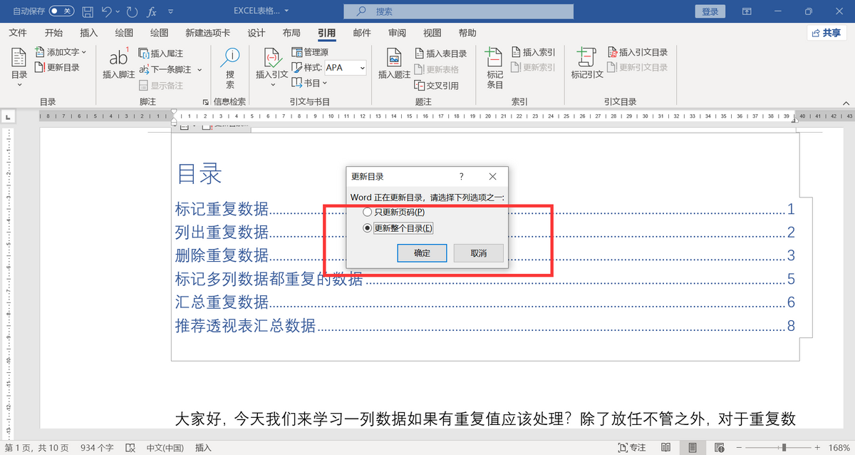 当有标题或是内容页面页码变更后,移动鼠标到目录上,点击“更新目录”。