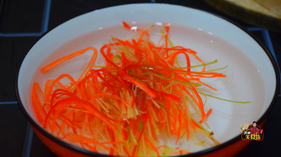 第一步:将生姜、大葱、红椒,分别清理干净,然后统一切成细丝,泡到水里面备用。