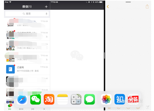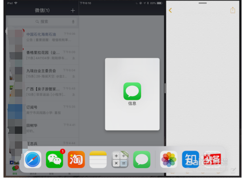 我们想左右分屏后再打开第三个APP浮屏,所以我们把第二个APP放在了右边,并轻轻划出Dock: