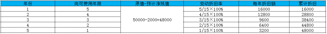 例如:某企业一项固定资产的原值为5万元,预计使用年限5年,预计净残值为2000元,按年数总和法计算折旧。