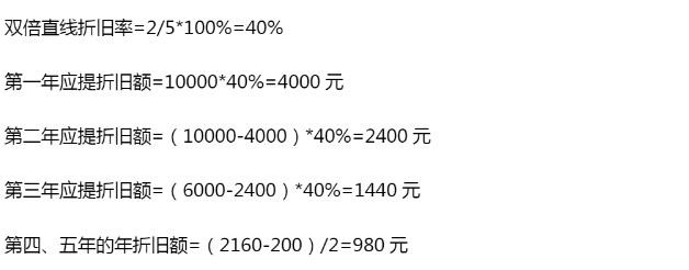 例如:某企业一项固定资产的原值为1万元,预计使用年限5年,预计净残值为200元,按双倍余额递减法计算折旧。