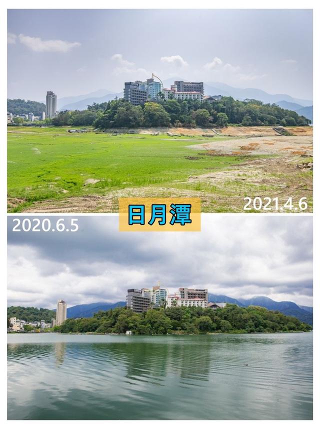 日月潭所在的南投县政府日前在社交网站上一连贴出7张知名景点的今昔对比照,包括日月潭、月牙湾、向山落羽松林、水社坝、日月潭自行车道、朝雾码头及大竹湖出水口,每张照片都可明显看到缺水带来的严重影响。