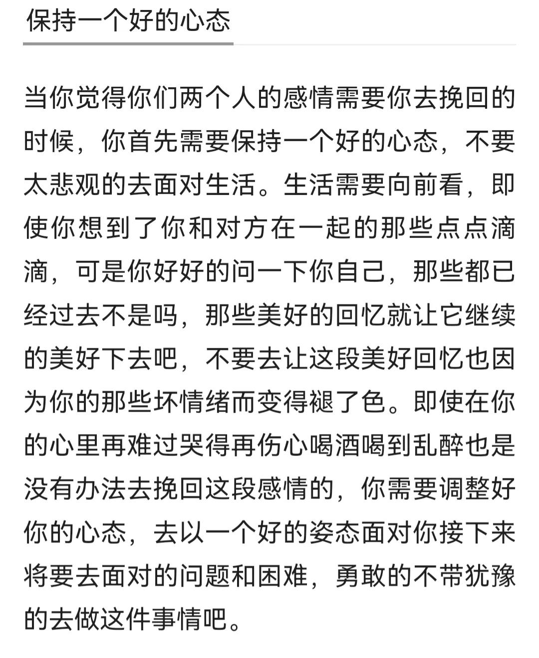 保持一个好的心态,在挽回的过程中有可能受到挫折这个时候,你要保持好一个好的心态,一定要正视你们两个人已经分手的这件事情,不要再沉浸于之前的那些点点滴滴,就只会让你越来越难受,从而没有一个好的心态去挽回她,不要再把他当作恋人和未来的另一半来看待,因为你们两个人现在已经分开了,你不能再去过于约束她。你现在做到的应该是体贴她,想着如何挽回他,首先你也应该提升自我的个人魅力,因为只要你变优秀他也会回头再重新审视你。其实多去健身房一些锻炼的地方,进行晨跑做一些瑜伽等有益于身体的运动,提升个人气质关心她,当一个人离开你有可能是属于你的关心,所以导致离开在分手以后你可以多去关心她让他对你放松戒备,从而对你的关心并不厌倦这个时候你已经成功了一半,多关注一些他的动态,看他最近有没有特别想要的或者经常去的娱乐场所,假装跟他偶遇提升你们两个人之间的感情。