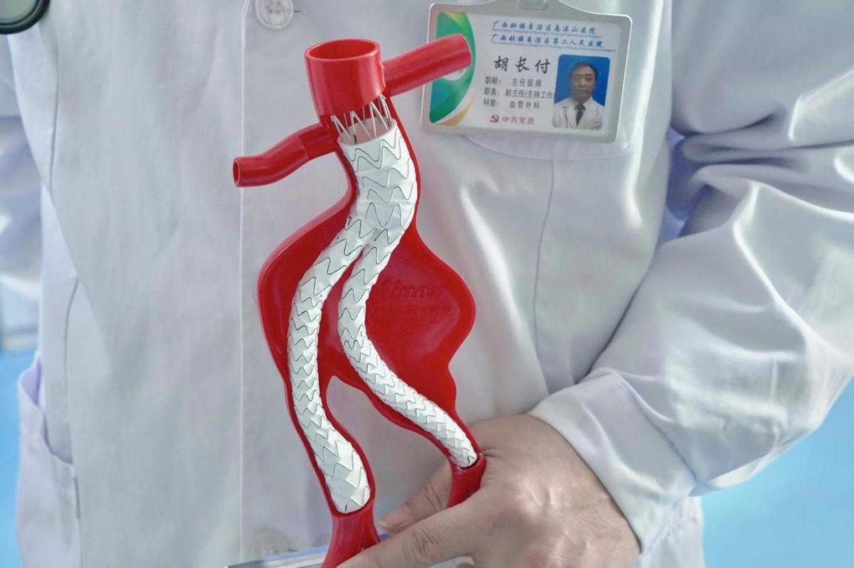 经检查,由于王大爷患有巨大腹主动脉瘤并髂动脉严重的扭曲,广西壮族自治区南溪山医院血管外科团队详细研究了王大爷的CT影像,经过反复讨论,制定了详细的手术方案。手术在介入室如期进行,血管外科主任胡长付医生眼睛紧盯手术屏幕,通过”导丝牵引”等技术克服髂动脉入路扭曲,支架输送就位后,以极稳定的速度,精确地按预计位点进行腹主动脉瘤腔内隔绝,最终手术圆满完成。