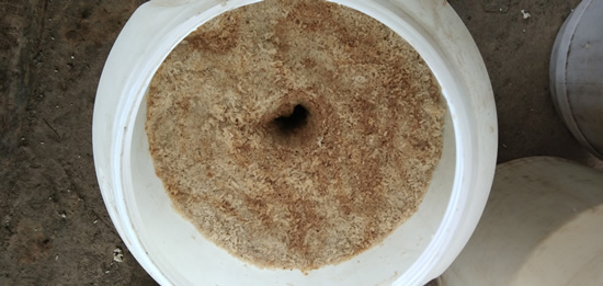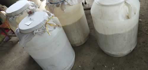 在去称好0.5斤的酒曲粉,让它和米饭充分的搅拌均匀,然后把它放到打桶里,中间打一个洞,把剩下的酒曲粉洒在上面,洒完后,先不忙盖上盖子,把干净的密集的布放桶口密封好。记住桶和布都要用高度的酒消毒过,而且全过程都不能沾油盐。大概发酵七天,七天后,把一桶的凉开水倒进去,再继续发酵,发酵越久越好。最少发酵三个月。发酵好后再拿去酿。