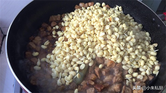 步骤三、下瘦肉丁煸炒变白,加料酒、胡椒粉、老抽、蚝油炒匀,下黄豆嘴加开水没过食材,开小火炖煮软烂