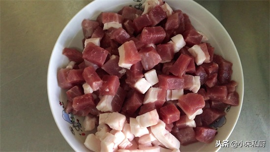 步骤一、发好的黄豆嘴洗净去外皮,后臀尖肉切丁