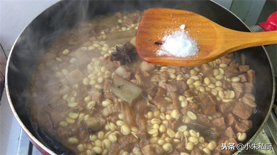 步骤四、肉和黄豆嘴软烂后加盐调味,中火炖汤汁粘稠出锅