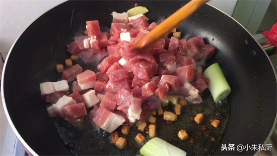 步骤二、锅内少许油将肥肉丁煸炒焦黄出油,下调料煸炒香