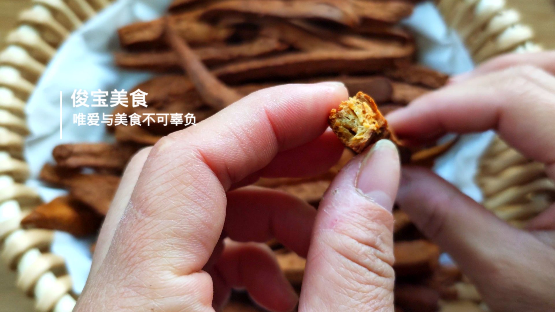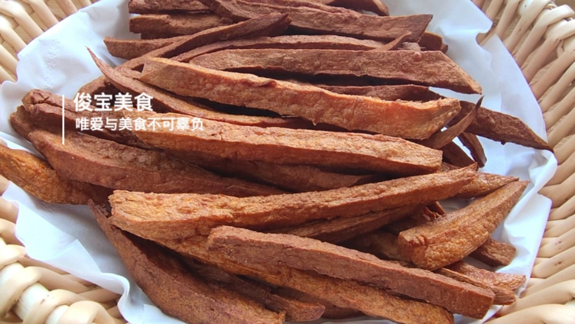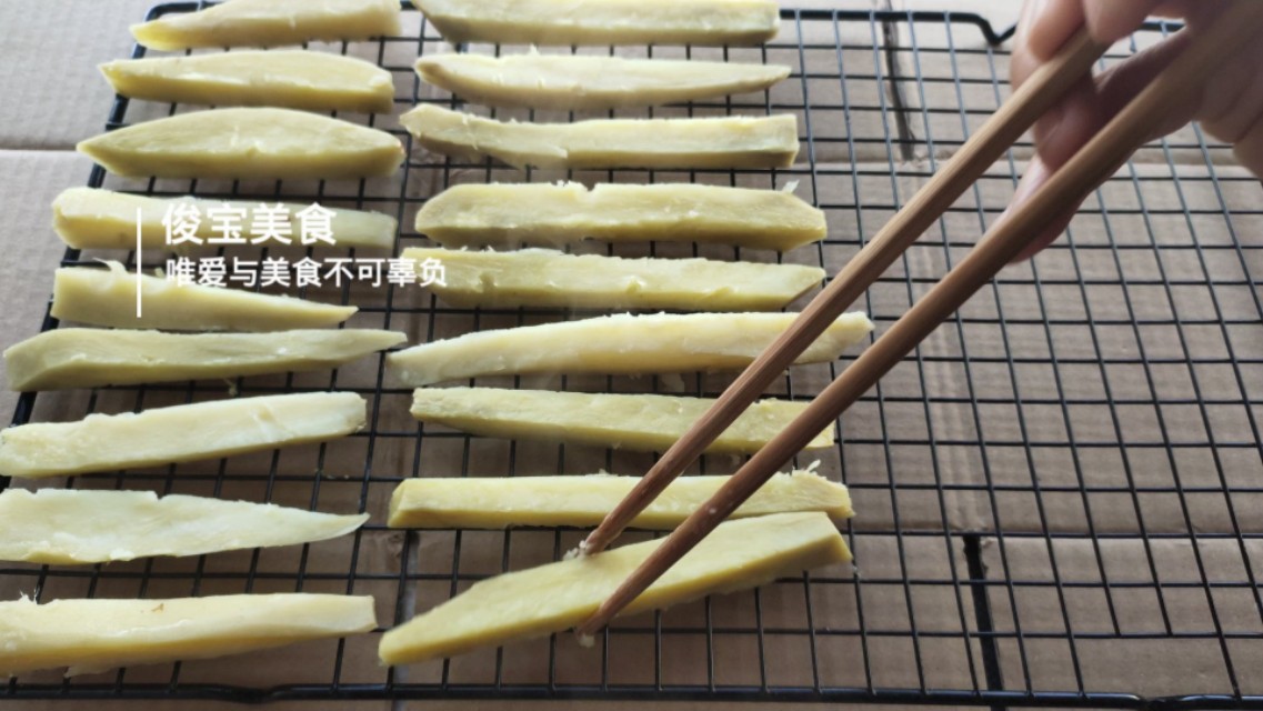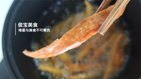 如果喜欢酥脆口感的,可以多加一步:油炸。油烧至四五成热,也就是放入一根筷子,筷子的旁边能冒起小泡泡。然后放入红薯干,中小火慢炸。火太大的话很容易就炸糊了,味道会发苦。火太小的话,炸出的红薯干只硬不酥。全部炸至金黄,就可以沥干油捞出了。