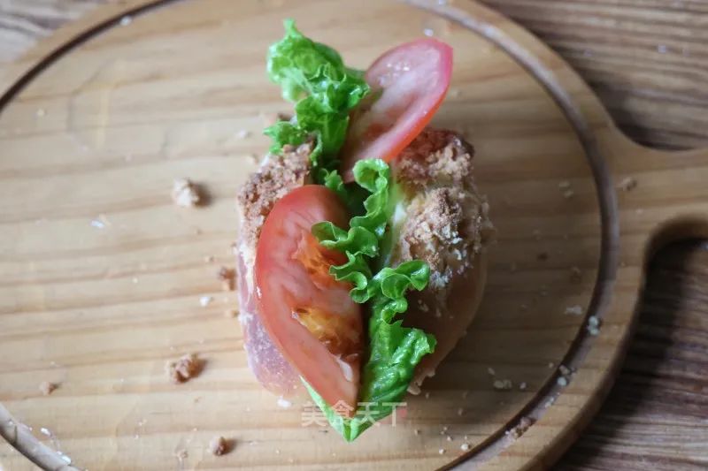 4. 汉堡对半破开。不切掉底、夹入生菜、西红柿片。