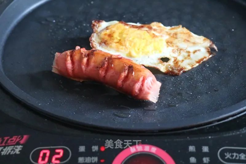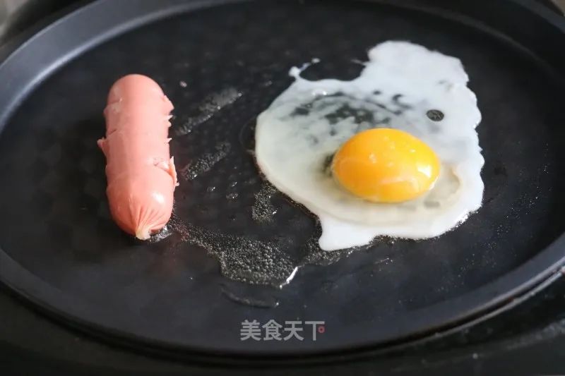 2. 把热狗剪一下、与鸡蛋一起入电饼档中。