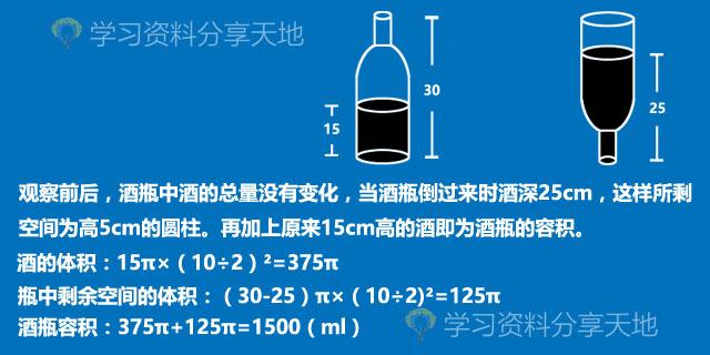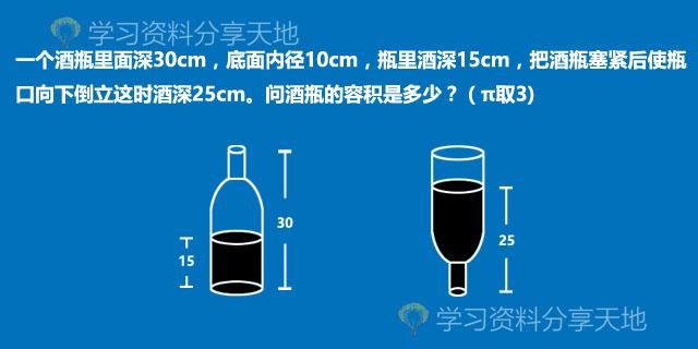 一个酒瓶里面深30cm,底面内径10cm,瓶里酒深15cm,把酒瓶塞紧后使瓶口向下倒立,这时酒深25cm。问酒瓶的容积是多少?(π取3)