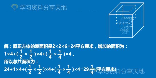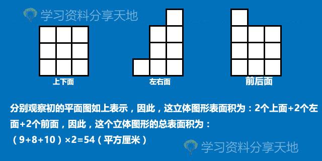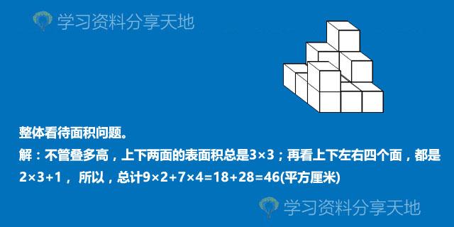 解析:立体图形的好处就是可以直观视觉,虽然图形被挖去,但6个面看过去是都还是面积不变的,特别是从上往下看是,3个正方形的下底面正好和剩下的面积等于原来的面积,这样就只增加了3个小正方体的各自侧面。