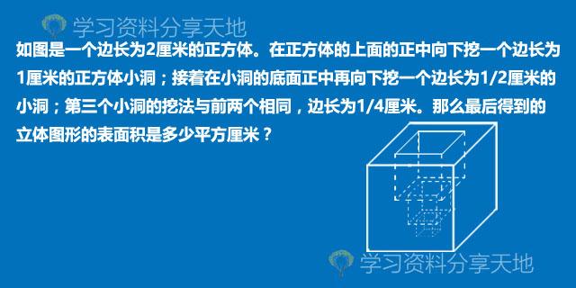 如图是一个边长为2厘米的正方体。在正方体的上面的正中向下挖一个边长为1厘米的正方体小洞;接着在小洞的底面正中再向下挖一个边长为1/2厘米的小洞;第三个小洞的挖法与前两个相同,边长为1/4厘米。那么最后得到的立体图形的表面积是多少平方厘米?