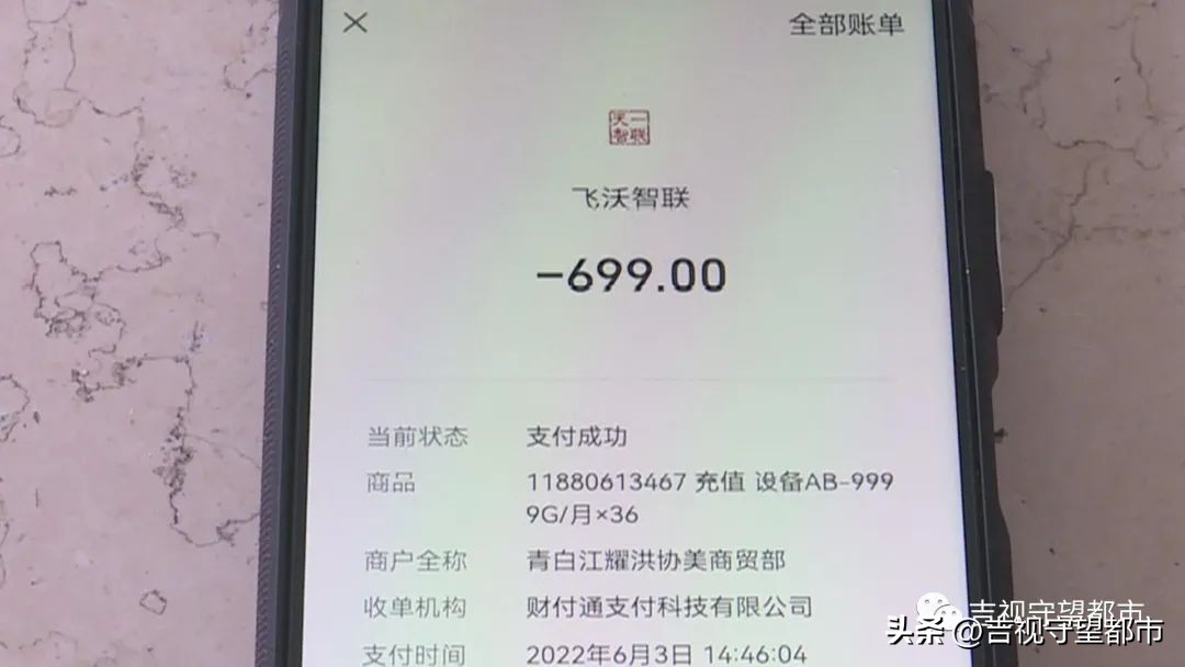 2022年6月3号,我在抖音平台极速4G5G个体店,买了一个随身wifi。当时是花69块钱买了一个设备,买了设备之后,客服提示我说你一次性充值三年的宽带费用是699元,这个设备69块钱我就返给你了,我感觉很便宜,我当时就充值了,充值了699元。
