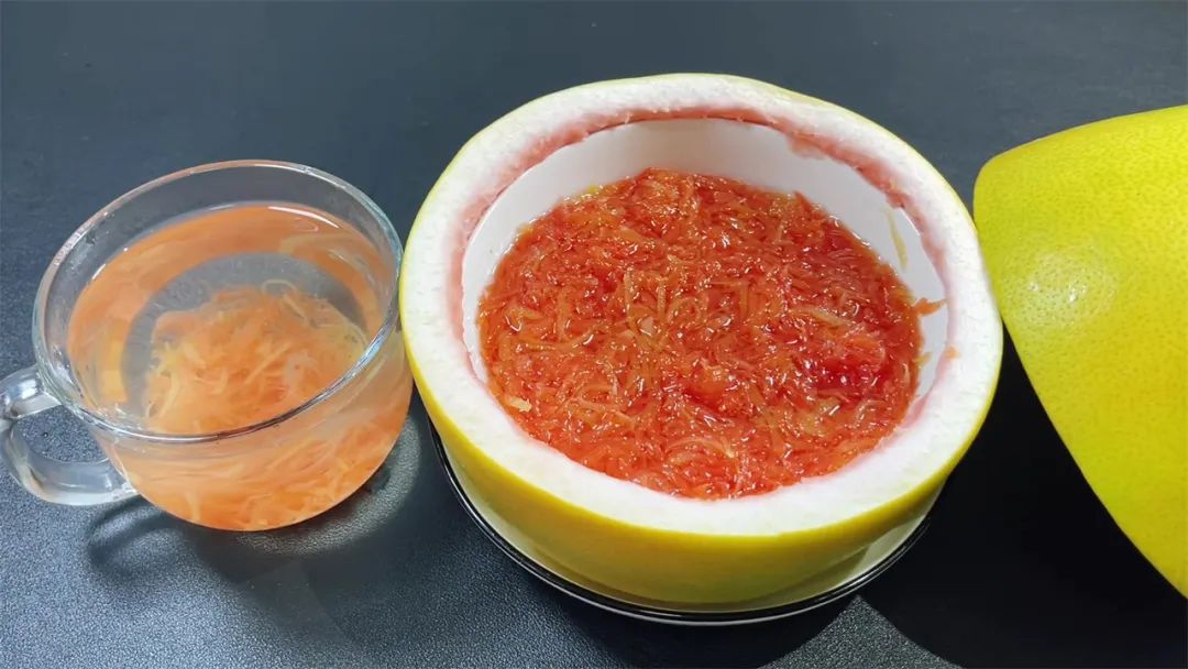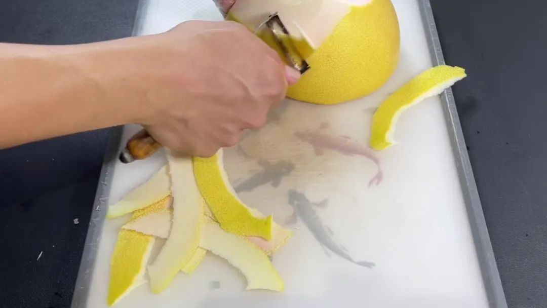 4、柚子皮用削皮刀刮下来,薄薄的一层就可以了,柚子皮千万不要削得太厚,太厚的话会很苦,我们用半个柚子皮就够了。