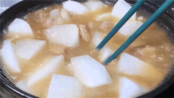 6、时间到后,排骨已经被煮软烂,汤汁变得浓稠,我们就可以放入白萝卜,用筷子搅拌几下,再盖上盖子焖30分钟左右。