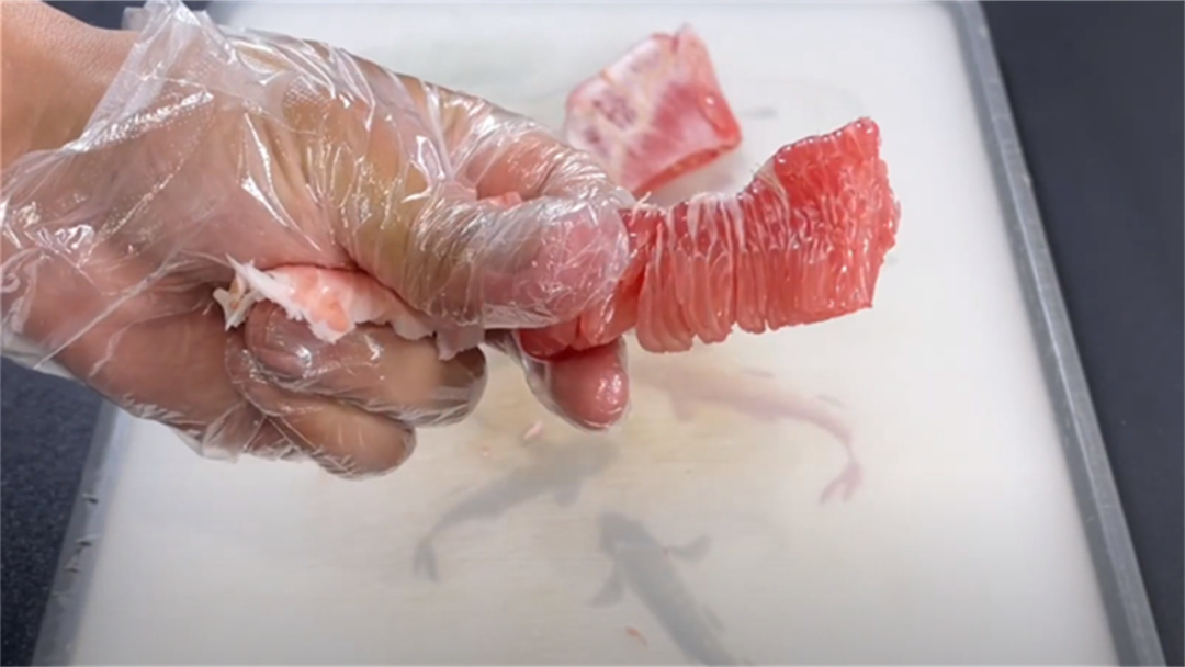 3、然后把柚子肉掰成小块儿,用刀从中间切开,把边上的一层白膜切掉,用手轻轻一撕,果肉就全部出来了,把果肉掰成小块备用。