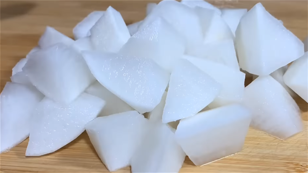 4、准备1个新鲜的白萝卜,用削皮刀削去外皮,清洗干净,切去头部和尾部不要,再改刀切成小块,装入大碗中备用。