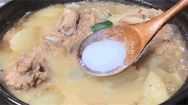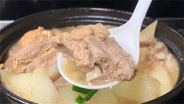 7、时间到后,排骨和白萝卜已经被煮软烂,用勺子将它搅拌一下,调味放入食盐、胡椒粉即可,有条件可以加点葱花点缀。