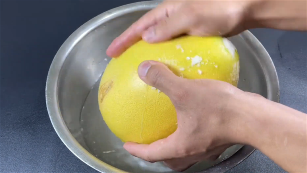 1、准备1个红心柚子,放入盆中,加入清水,放入食盐用手揉搓清洗,把柚子皮彻底洗净,柚子皮等会还要用,所以我们要认真清洗。