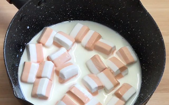 第一步:小奶锅里加入200克纯牛奶,70克棉花糖